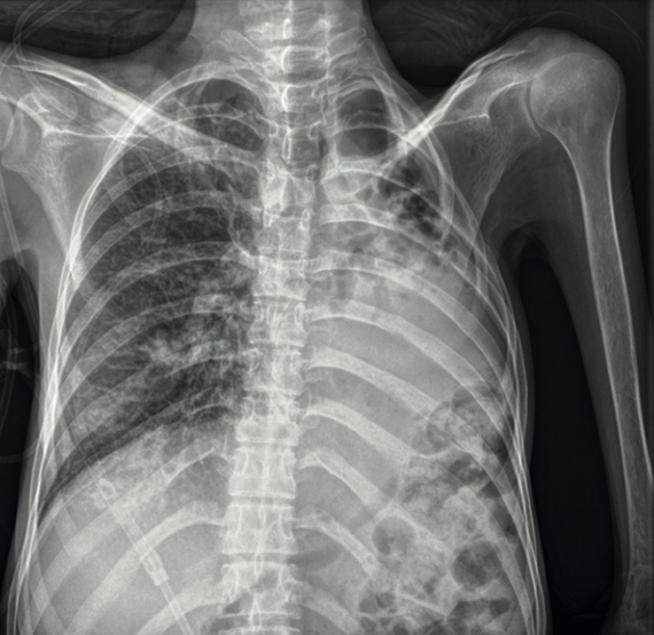 Se determinó la necesidad de atención médica multidisciplinaria, en coordinación con los servicios de neumología, genética, reumatología, cirugía plástica, nutrición clínica, oftalmología y epidemiología. La hipertensión arterial pulmonar se excluyó con base en el ecocardiograma, radiografía de tórax y angiotomografía torácica. En esos estudios se identificaron hallazgos compatibles con tromboembolia pulmonar, evidenciada por el defecto de llenado central en el tronco del lóbulo basal derecho (Figura 2). La anticoagulación se inició con 1 mg/kg de enoxaparina.