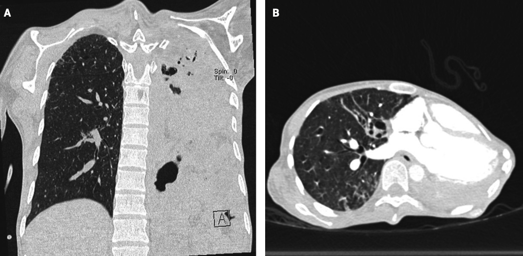 Además, se consideró la posibilidad de tuberculosis pulmonar, debido a la coexistencia de bulla en el segmento apical y múltiples nódulos con tendencia a la confluencia en relación con zonas de consolidación (Figura 3), que se descartó con la baciloscopia negativa.