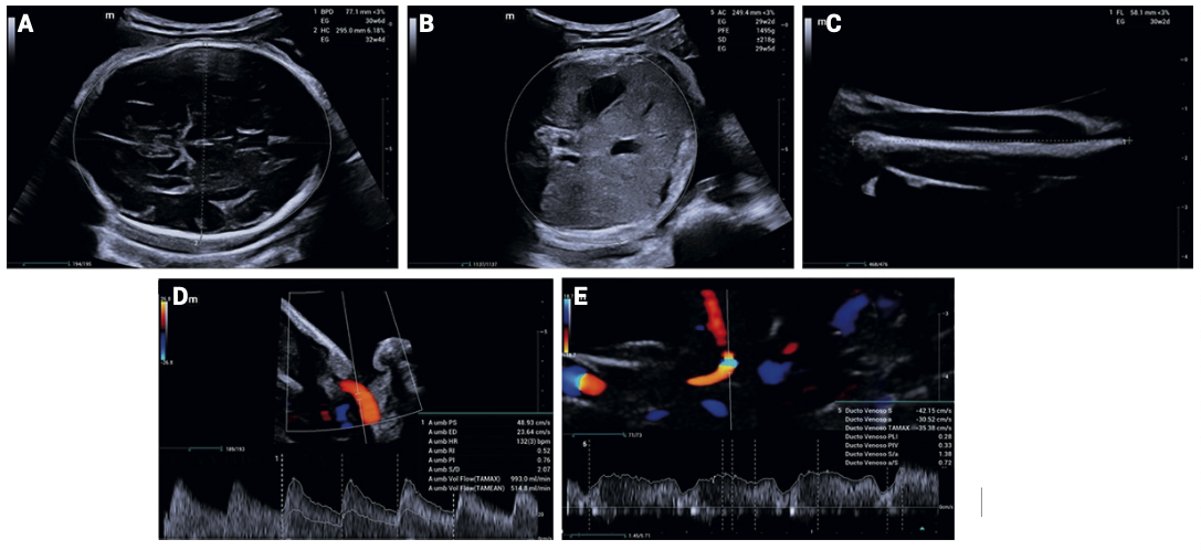 En la última ecografía, a las 36 semanas de gestación, se encontró en presentación pélvica, frecuencia cardiaca de 143 lpm, con fetometría promedio correspondiente a 30.1 semanas, con peso fetal estimado de 1579 g (percentil < 3). El índice de líquido amniótico se determinó en 17.0 cm, placenta corporal anterior, hemodinamia fetal conservada y perfil biofísico 8/8. Con base en estos hallazgos se confirmó la persistencia del diagnóstico de restricción del crecimiento fetal estadio I.